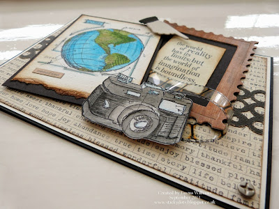 We all know how difficult men's cards are to make and there is so little on the market to make them with!! But when I was asked to make a set for the September issue, I knew exactly what I wanted to do and headed straight for these little babies...Tim Holtz's Travel Blueprint stamp set. With the addition of a few Sizzix die cuts, some Teresa Collins' papers and lots of Distress products, this is the first of the two cards I made ~ as always, I hope you love them!!