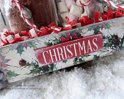 Hope you're all having a wonderful weekend! Today, I'm popping by to share a fun project that I created using Tim Holtz's idea-ology products. I actually created this project with only one person in mind ~ Santa, and made him a treat box ready to put out on Christmas Eve because in our house, we always leave a little something for him, Rudolph and all the reindeers when he comes to visit! Of course, there are many other options for this and it would make a wonderful gift idea for anyone who loves hot chocolate! Or maybe you can fill it with other treats that would suit the recipient ~ whether it be beauty products, coffee, cookies or you even lights and have it as a display, the choice is yours and that's where the fun begins!