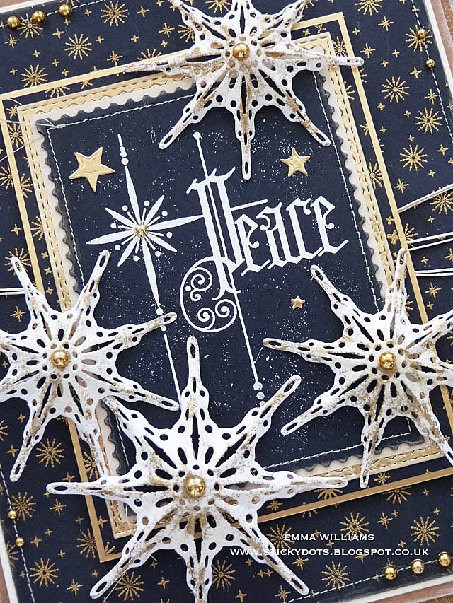 We'll start with the background and for this I used a piece of navy blue cardstock, cut to measure 16 x 19cm and inked up the appropriately named Snow Sparkles stamp from the Tim Holtz Christmas Nostalgia Stamp Set, using a Versamark Watermark Ink Pad. I then stamped over the entire surface of the blue card panel to create a repeat pattern before sprinkling with gold embossing powder and heat embossing the design until it was molten and shiny.