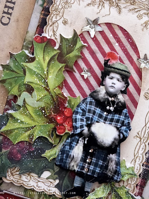 I mounted this darling little girl onto a frame, that is in the Ephemera pack and placed a panel of the candy stripe Worn Wallpaper behind the aperture. I arranged the paper doll with a selection of holly pieces, taken from the Worn Wallpaper pack and the Christmas Botanicals Layers before applying small amounts of Snowfall Grit paste to the leaves and splattering a dusting of Picket Fence Distress Paint over the top.