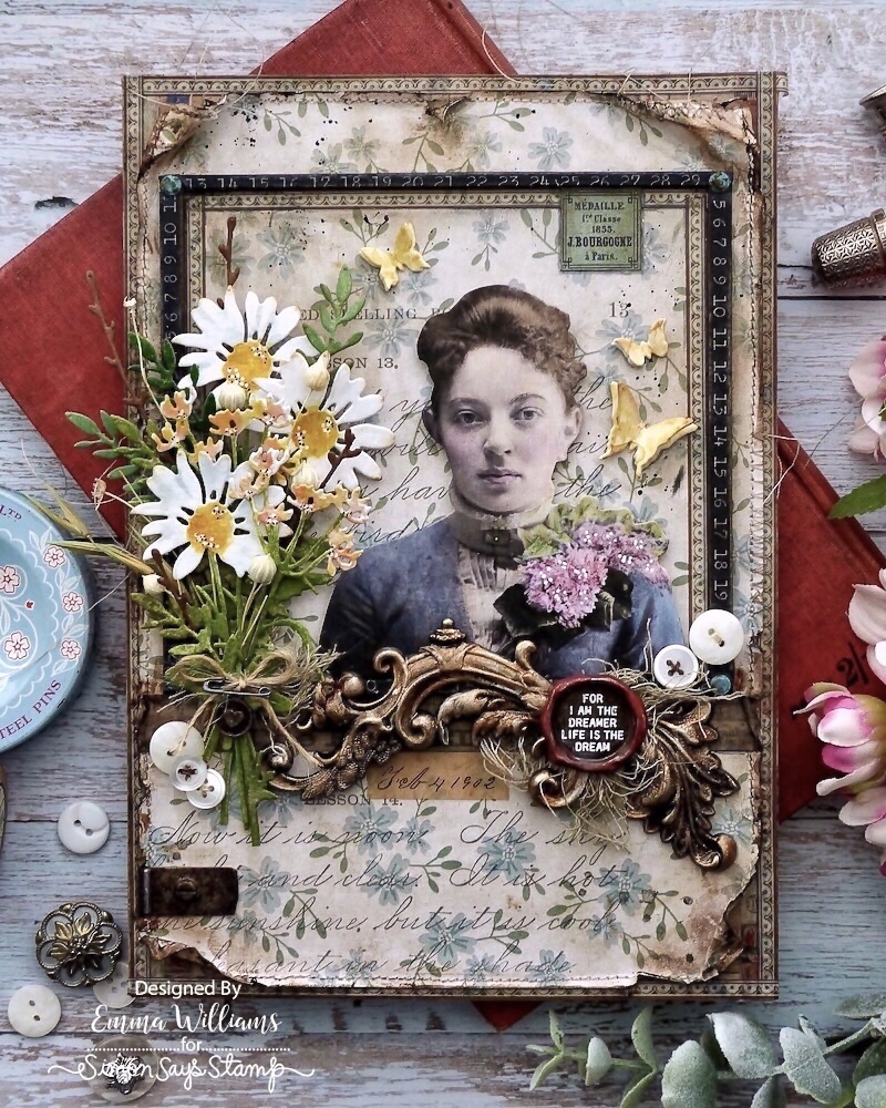 Black Soot, Salvaged Patina, Crackling Campfire Distress Crayons: Walnut Stain, Picket Fence, Faded Jeans, Picked Rapsberry, Tea Dye, Tattered Rose, Gathered Twigs, Aged Mahogany and Rustic Wilderness Tim Holtz Idea-ology: Hardware Heads, Backdrops vol 2, Memoirs Ephemera Pack, Word Tag, Design Tape, Paper Dolls Portraits, Flourish Adornments, Quote Seal, Transparent Things 2, Mini Pins, Mummy Cloth, Type Chip, Curator Ephemera Hot Glue Gun